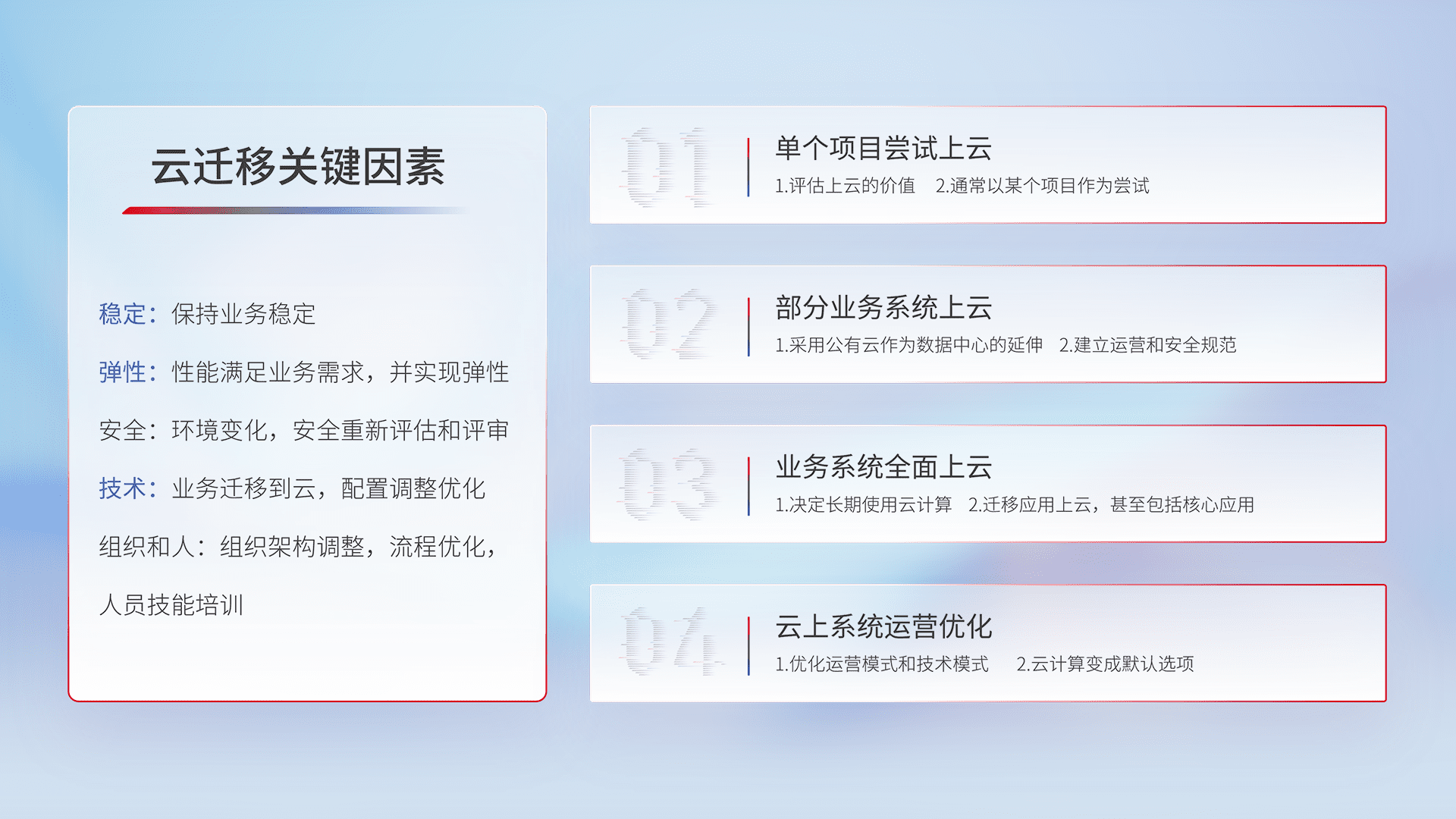 结合实际业务,,,从规划设计、、、、云平台选型、、云原生改造、、数据迁移、、、集成交付,,,,迁移全过程为客户识别最佳上云路径,,做好风险识别管理,,,,设计网络架构、、、、身份权限、、安全审计合规、、、操作审计、、、、日志审计、、、监控告警策略、、、、多站点容灾设计等,,,,对云上基础设施进行整体规划,,提升IT治理水平,,,以满足弹性、、、、高可用、、、高性能的需求。。。。